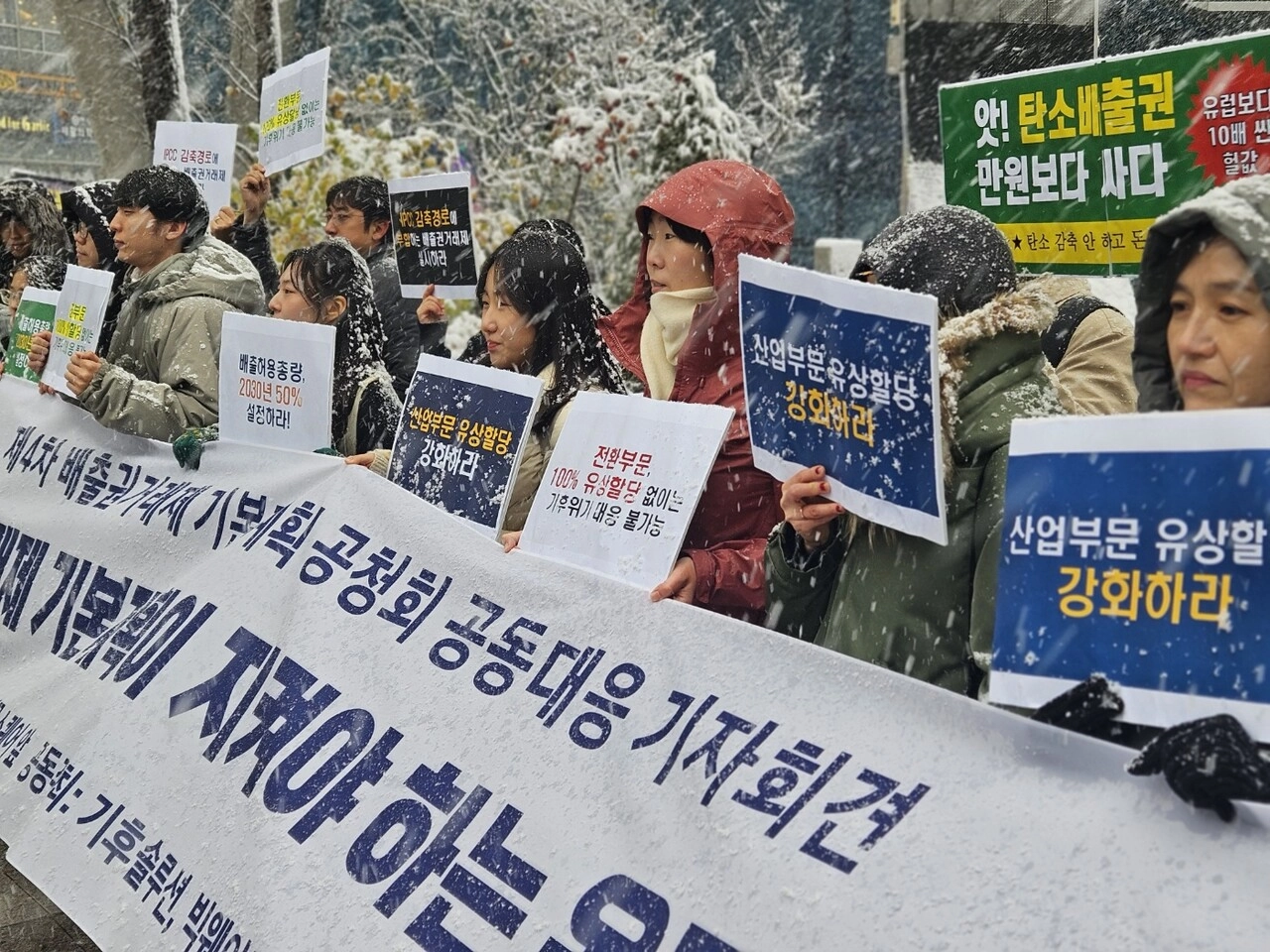기후솔루션 등 환경단체들이 27일 서울시 마포구 소재 누리꿈스퀘어에서 열린 ‘제4차 배출권거래제 기본계획(안)’ 공청회장 앞에서 산업·전환 부문 유상할당 100%를 요구하고 있다. [사진=오유진 기자]