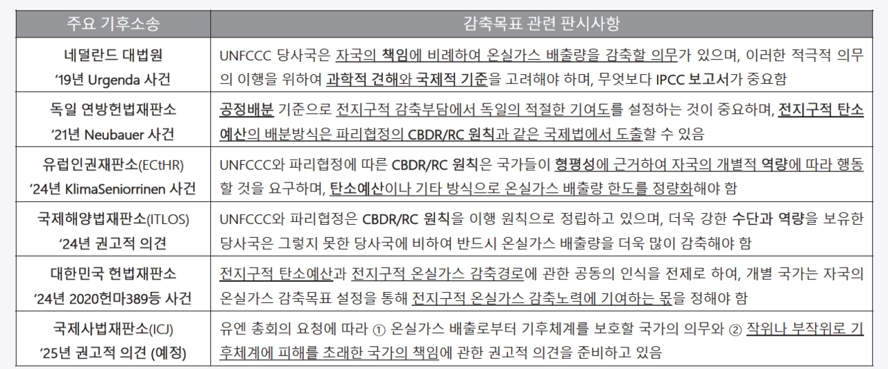 유럽인권재판소도 유엔 기후변화협약과 파리협약에 따른 CBDR/RC 원칙은 국가간 형평성에 근거해 자국의 개별적 역량에 따라 온실가스를 감축할 것을 요구하며 탄소예산이나 기타 방식으로 온실가스 배출량 한도를 정량화할 것을 요구하고 있다.