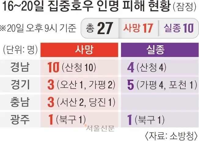 전국 폭우로 17명 사망·10명 실종