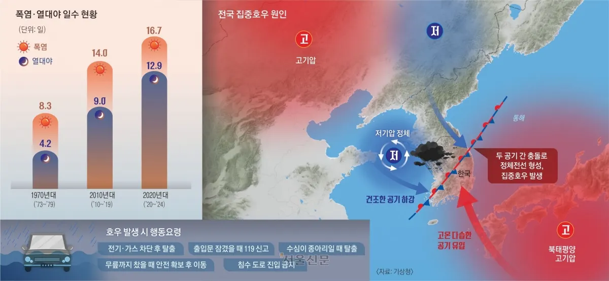 손석우 서울대 지구환경과학부 교수는 “국지 가열, 지형 효과, 수증기 이동 같은 복합 요인이 작용했고 올해는 해수면 온도까지 비정상적으로 높아져 구름 유입량이 늘었다”며 “기후 위기가 극단적 기상이변의 조건을 만들고 있다”고 말했다.
