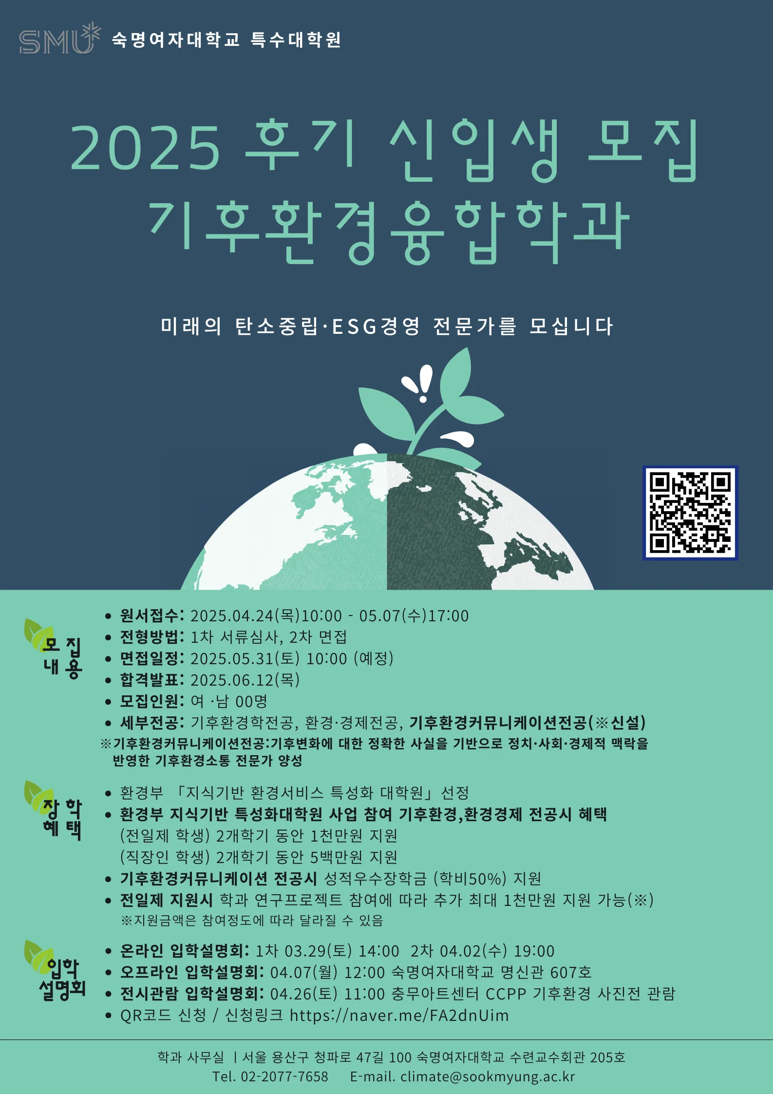 [숙명여대 특수대학원 기후환경융합학과] 2025 후기 여/남 신입생 모집(석사과정)