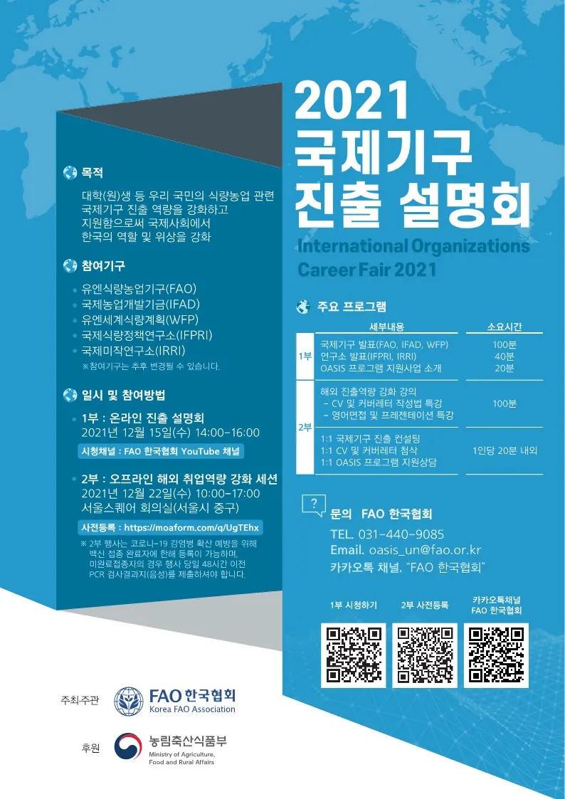 FAO 한국협회는 2014년도부터 대학(원)생 등 우리 국민의 국제기구 진출 지원을 위해 매년 농업 분야 국제기구 진출 설명회를 개최하고 있습니다. 2021년 국제기구 진출 설명회는 1~2부로 구성되어 있으며, 온·오프라인으로 진행될 예정이오니 국제기구 진출에 관심있는 분들의 많은 참여 부탁드립니다.