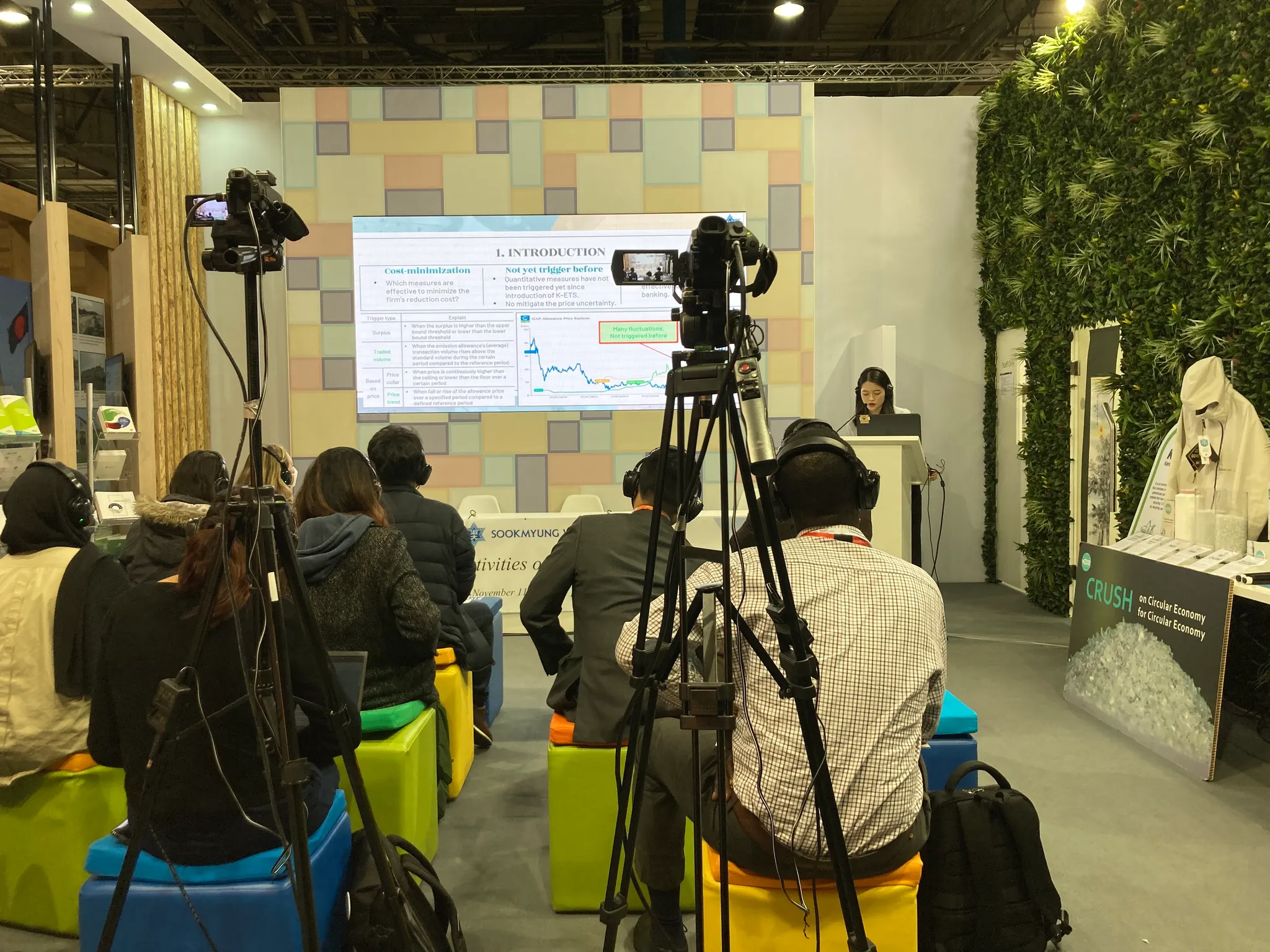 유승직 교수님께서는 "모델 구축 연구 개요", 정수연 연구원은 "대한민국 배출권거래제 제1차, 제2차 계획기간의 주요 성과 및 현안", 배경은 연구원은 "대한민국 배출권거래제 가격상하한제 영향 연구", 양혜영 연구원은 "도로수송부문 온실가스 감축 정책의 효과성 연구", 원유준 연구원은 "대한민국 배출권거래제 도로수송부문 포함 방안 연구"에 대해 각각 발표하였습니다.