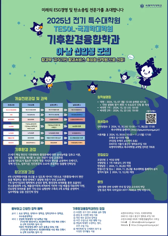 [특수대학원 TESOL국제학대학원 기후환경융합학과] 2025학년도 전기 여/남 신입생 모집(석사과정)