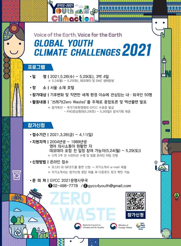 올해 서울에서 실시하는 2021 P4G 정상회의 개최와 연계해서, 진행하는 글로벌청년기후환경챌린지(GYCC 2021)는 올해 2회째 실시하고 있는 행사 입니다.
