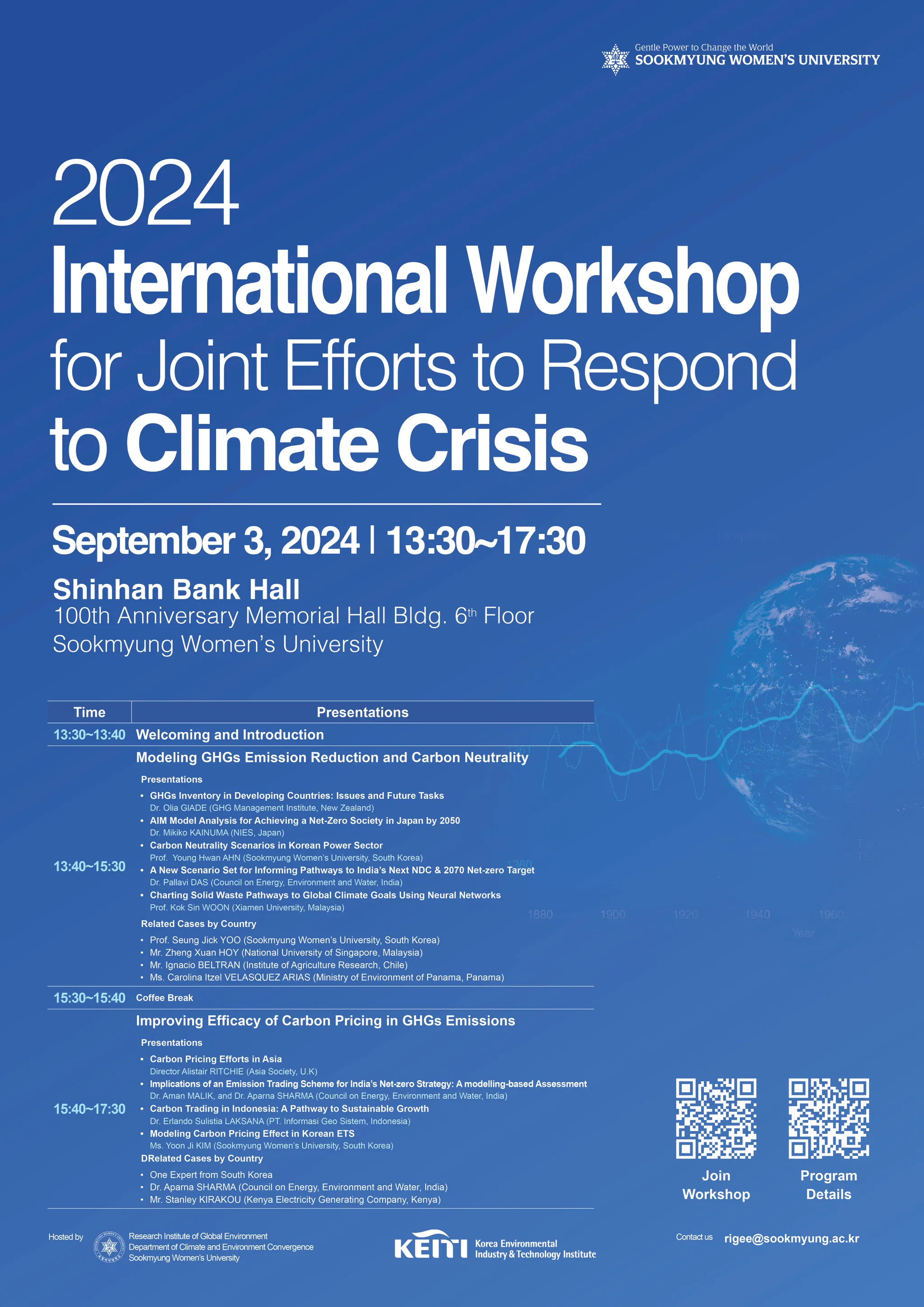 숙명여자대학교 산하 지구환경연구소와 한국환경산업기술원 ‘지식기반 특성화대학원 지원사업’의 후원으로 진행되는 본행사는 세계적인 기후변화 전문가들이 모여 온실가스(GHG) 감축과 관련된 최신 연구와 정책 방향을 논의합니다. 2024 기후위기 대응을 위한 국제 워크숍은 1~2부로 구성되어 있으며, 오프라인으로 진행될 예정이오니 기후위기에 관심있는 분들의 많은 참여 부탁드립니다.